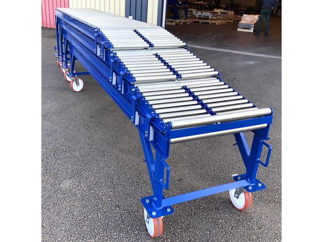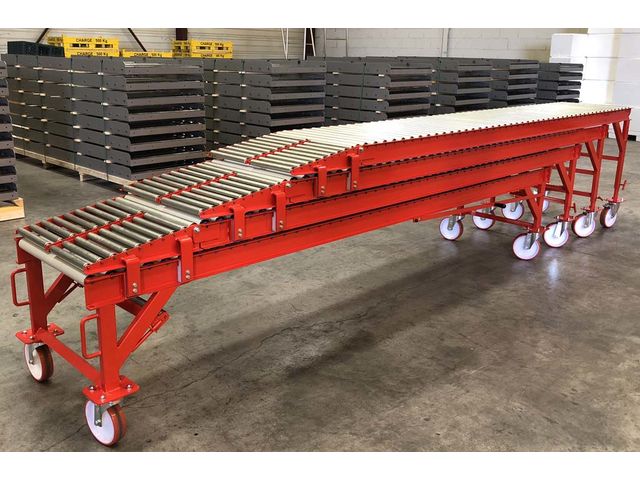 Rulolu Teleskobik konveyör malları taşımak için yerçekimini kullanıyor. Tıra yüklemede ürünlerin avare düşüşü tercih edilirse rulolu teleskobik konveyörler kullanılabilir.